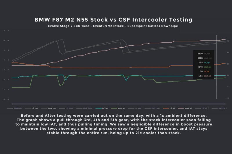The CSF N55 Intercooler's Stepped Core Design maximizes surface area contact and internal intake air-flow volume. The Rounded Front Face Bar/Plate Design optimizes airflow through the core and is a true "Drop-in Fit" Plug-and-Play Design. In testing the CSF Intercooler showed Intake Air Temperatures (IATs) that were 38 deg F (21 deg C) lower than factory after just 3 consecutive pulls from 4k RPM to 5.8K RPM. In that test, the CSF Intercooler maintained stable IATs. While most intercoolers don't offer immediate performance gains without increasing boost pressure, the CSF Intercooler shows an increase of 15-20hp on stock N55 Powered BMW's and 25+hp on modified examples.