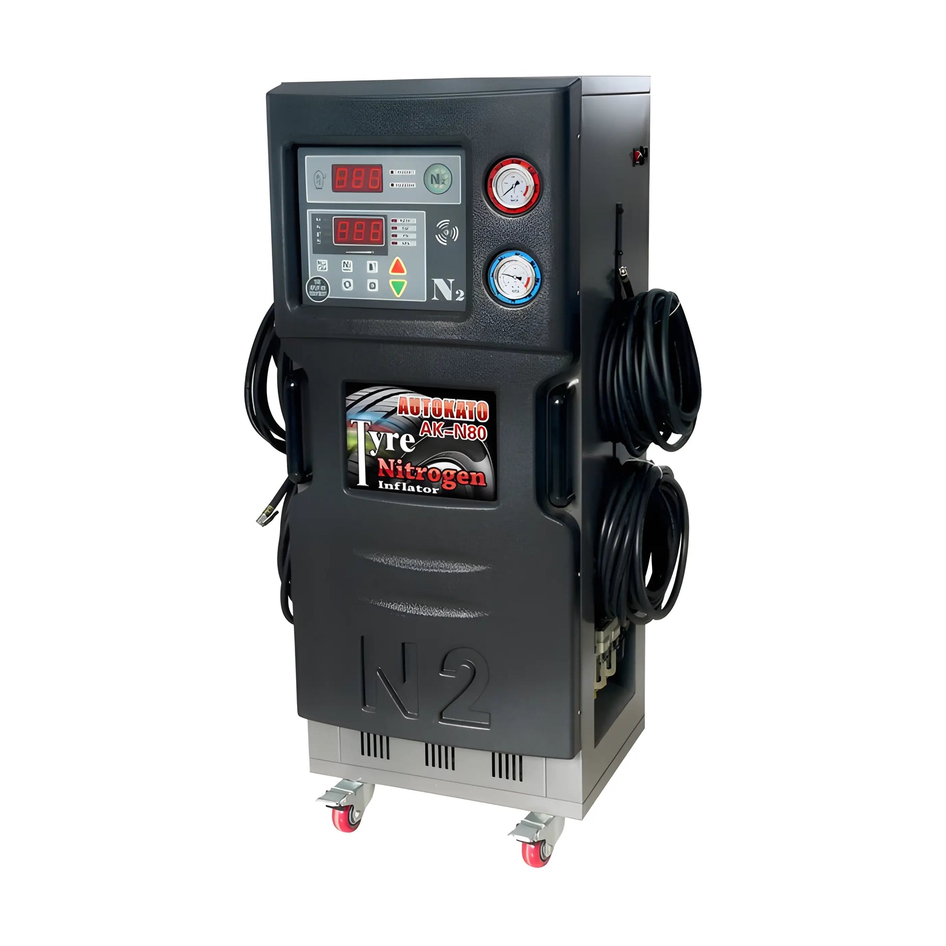 The Katool KT-N80 is the world's only all-hydraulic power system, and it works with all car wheels. Its compact and sleek design makes it visually pleasing, not to mention a powerful addition to any workshop. The system produces high-purity nitrogen and ensures the best possible results in tire inflation.